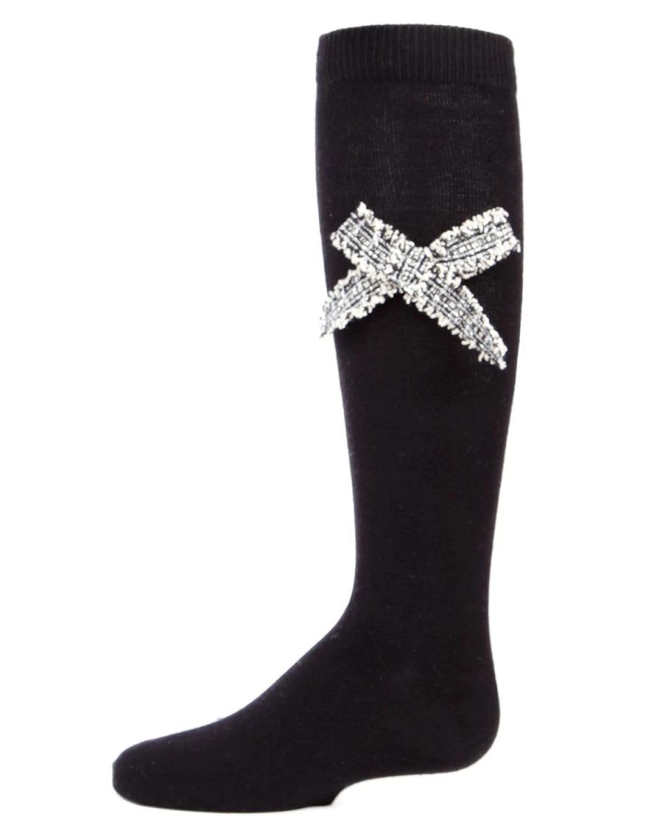 Your daughter wants her personality to reflect in all her clothes – even her socks. Tidy Little Bow Girls Knee Socks add a touch of that personality right to the sides of ordinary knee socks. A tweed bow in contrasting colors breaks up the monotony of the plain sock, while a pinch of sparkle throughout the tweed elevates the bows from basic to anything but.
