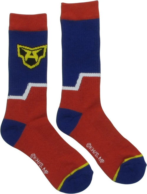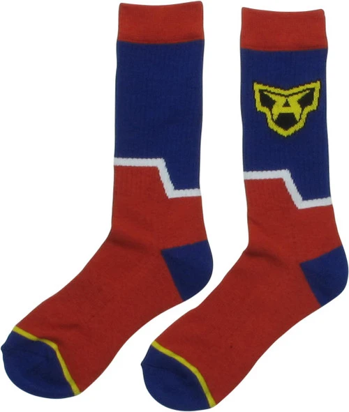 “Go Beyond” wearing this colorful and cool pair of My Hero Academia socks! The My Hero Academia All Might Symbol Crew Socks are red with blue heels and toes. Inspired by the manga and anime series My Hero Academia, the socks echo the costume worn by All Might, Japan’s mightiest superhero, with the gold “A” symbol, the blue-and-white pattern, and a gold stripe. Plus Ultra!