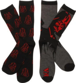 Sinister images of the best-known evil Sith Lord in the galaxy decorate this cool set of Star Wars socks! The Star Wars Darth Vader 2 Pack Crew Socks Set includes two pairs of crew socks, one black and one gray with black cuffs, heels and toes. Inspired by the Star Wars movie series, each sock features red-outline images of Darth Vader, the evil Sith Lord and protector of the Galactic Empire!